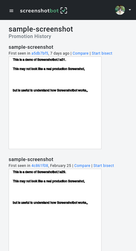 Keep in mind that Screenshotbot can only tell you the first commit that introduced the bad screenshots. In certain situations, this might not correspond to the actual blame commit (for example, if the build was broken on the blame commit). But even in those cases it's usually sufficient to look at a few ancestor commits to find the blame.