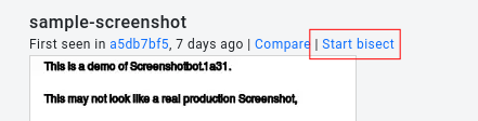 First, select the "bad" screenshot. Typically this will be the latest screenshot. Use the Start bisect action to start the bisection process:
